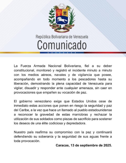 En un comunicado, Gil señaló que el incidente ocurrió el viernes 12 de septiembre, cuando marines estadounidenses abordaron a nueve pescadores venezolanos que se encontraban en el mar Caribe. El canciller condenó enérgicamente la acción y la calificó de «hostigamiento», haciendo un llamado a la comunidad internacional.