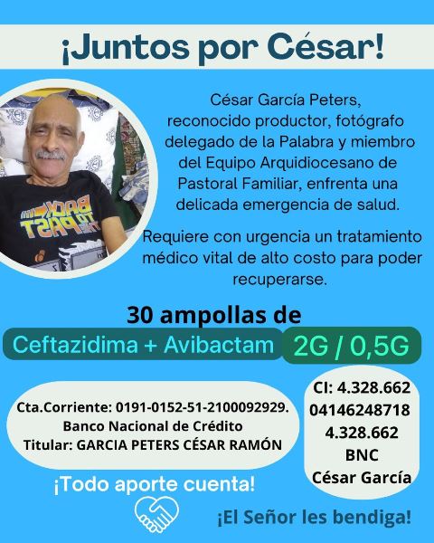 César García Peters necesita apoyo inmediato. Su estado de salud se ha complicado y requiere con urgencia el medicamento Ceftazidima + Avibactam 2G / 0,5G, vital para su recuperación. La ayuda urgente por César García se ha convertido en un llamado solidario que moviliza a quienes lo conocen y admiran.