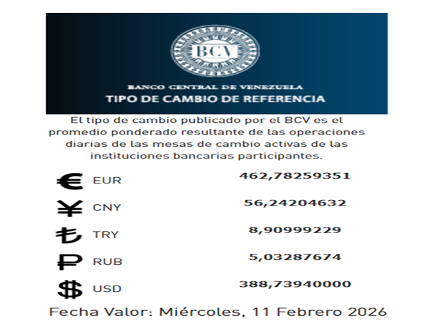 Al cierre de las operaciones en las mesas de cambio de las instituciones bancarias, el Banco Central de Venezuela (BCV) definió el valor del tipo de cambio oficial que regirá durante este miércoles 11 de febrero.
